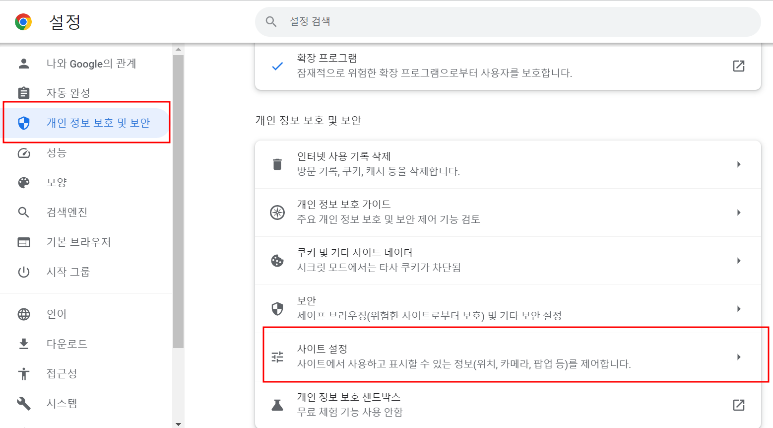 1-2. 개인정보보호 및 보안을 클릭하면...화면 오른쪽에. 아래의 사진에서 네모박스 표시해 놓은 곳이 뜹니다 .
