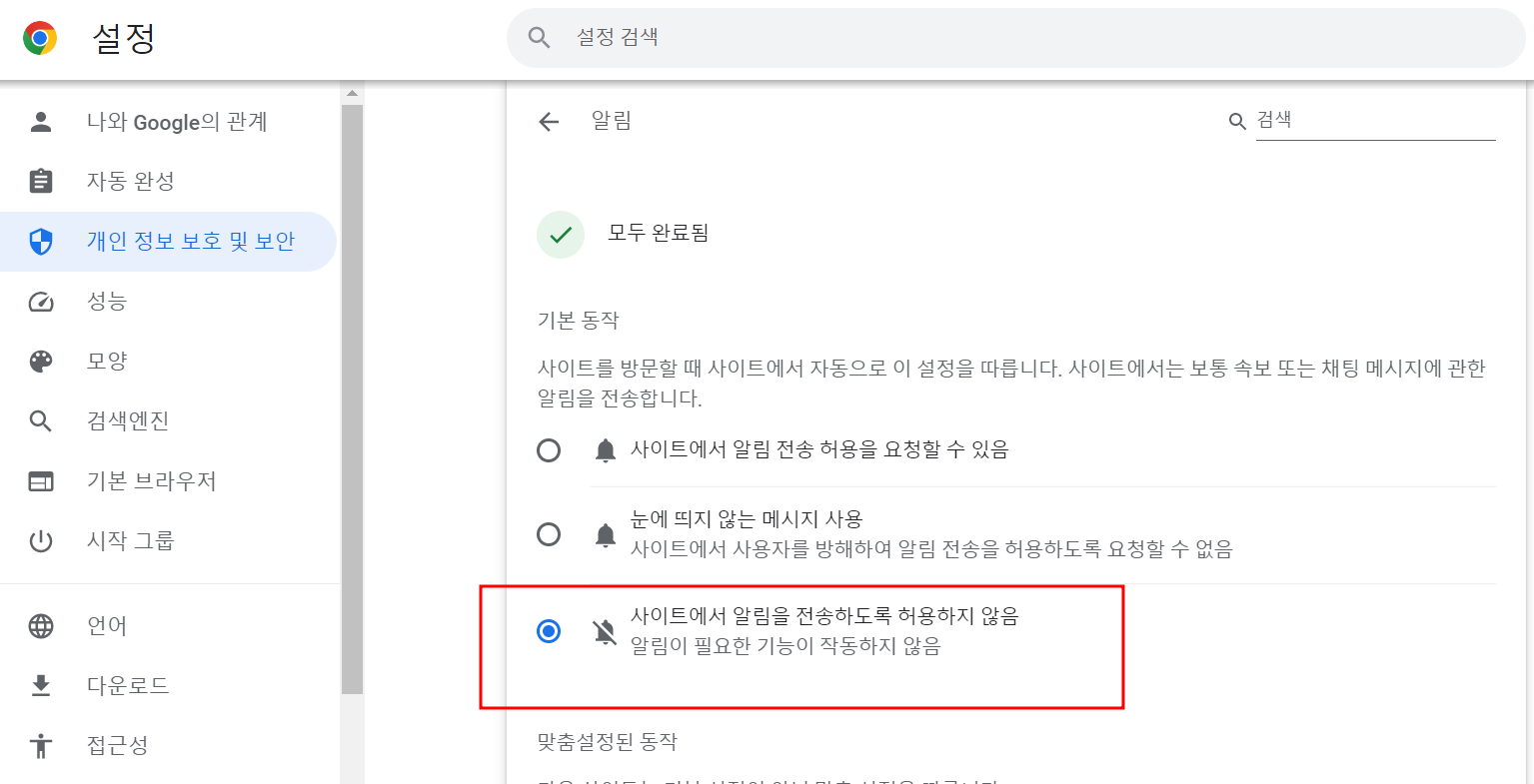 4. 위의 사진에서 빨간 네모로 표시해 놓은 곳. 그것을 클릭해서. 알림을 차단합니다.