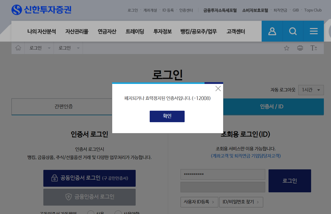 신한투자증권에서 공동인증서를 갱신한 이후 여러 문제점이 지속적으로 반복되고 있다.