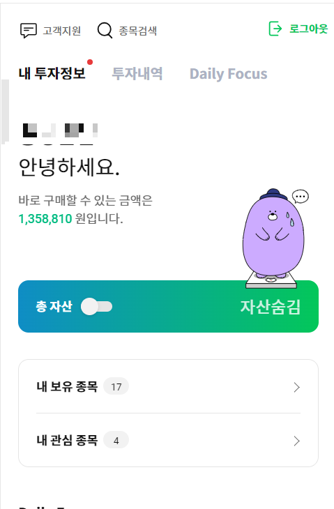 아래의 사진은 네이버 웨일에서 내가 보유한 주식 목록을 확인한 것인데.