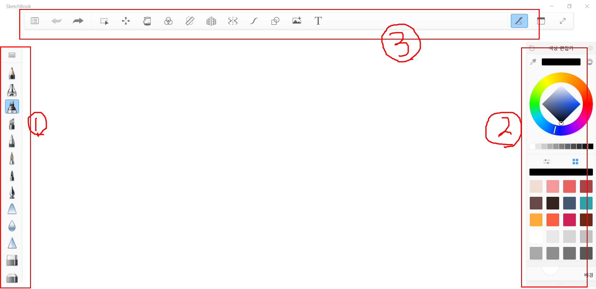 -> 오토데스크 스케치북의 '메뉴'는 위의 그림과 같이 3부분으로 나뉘어져 있다.