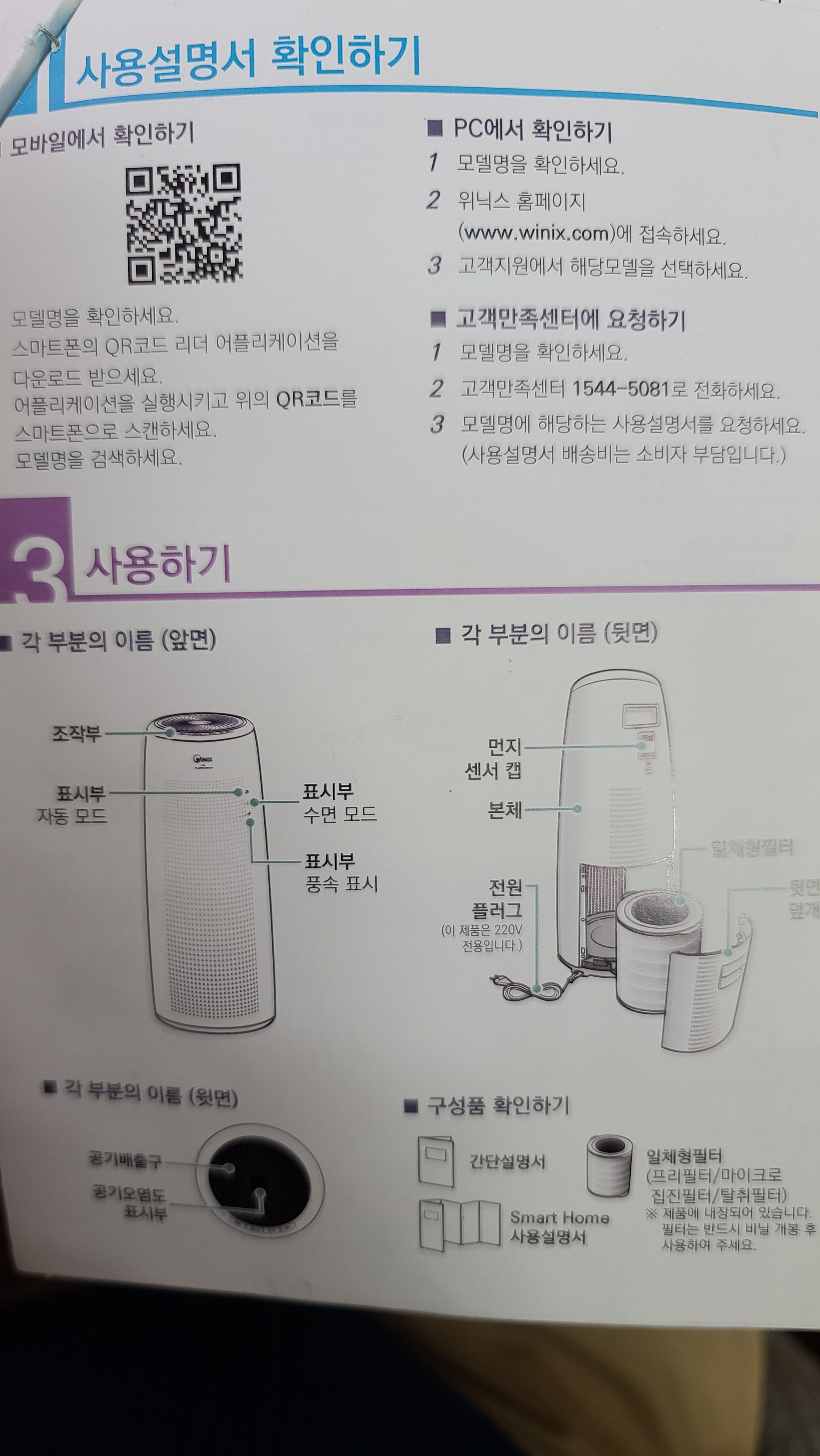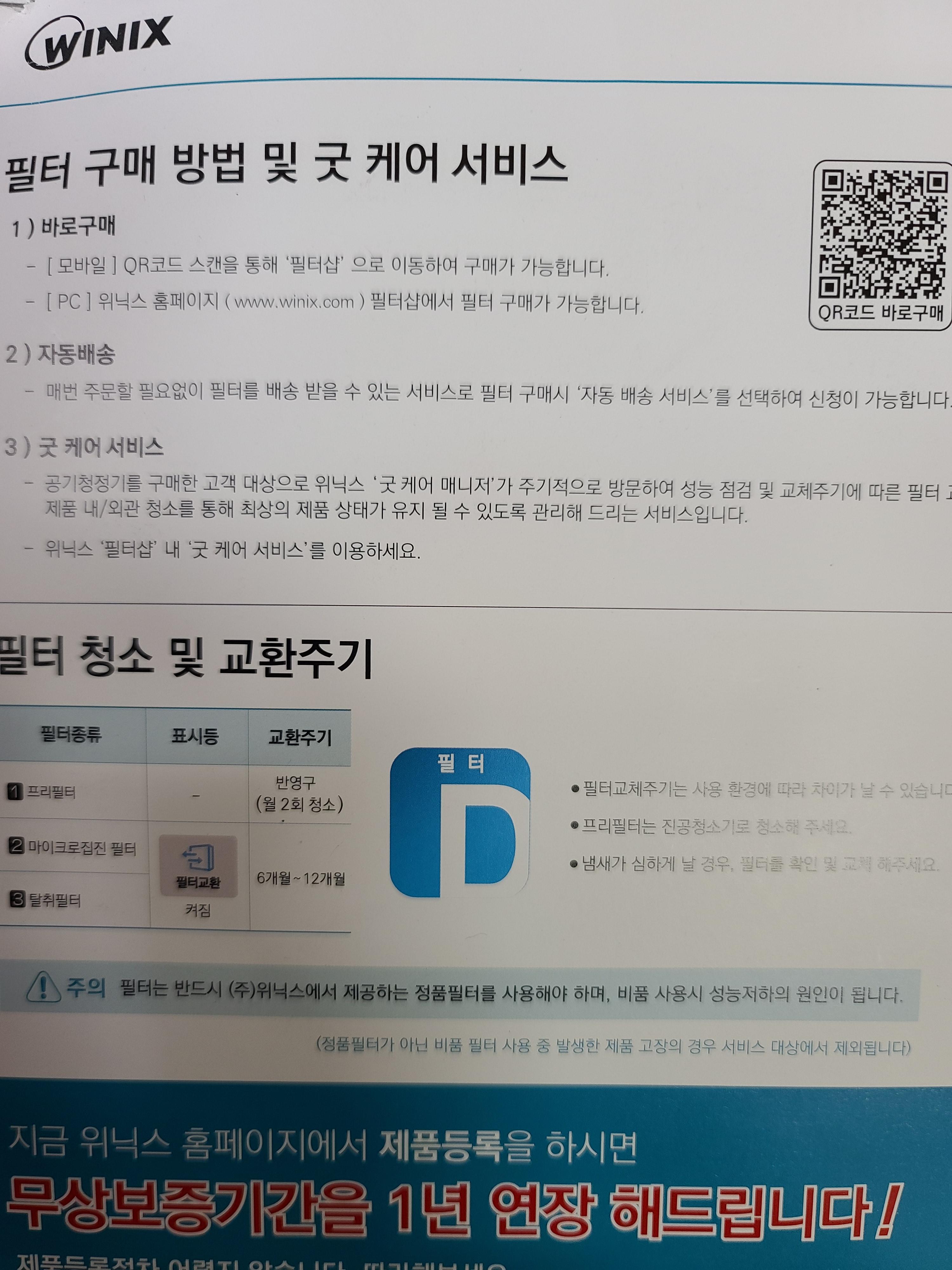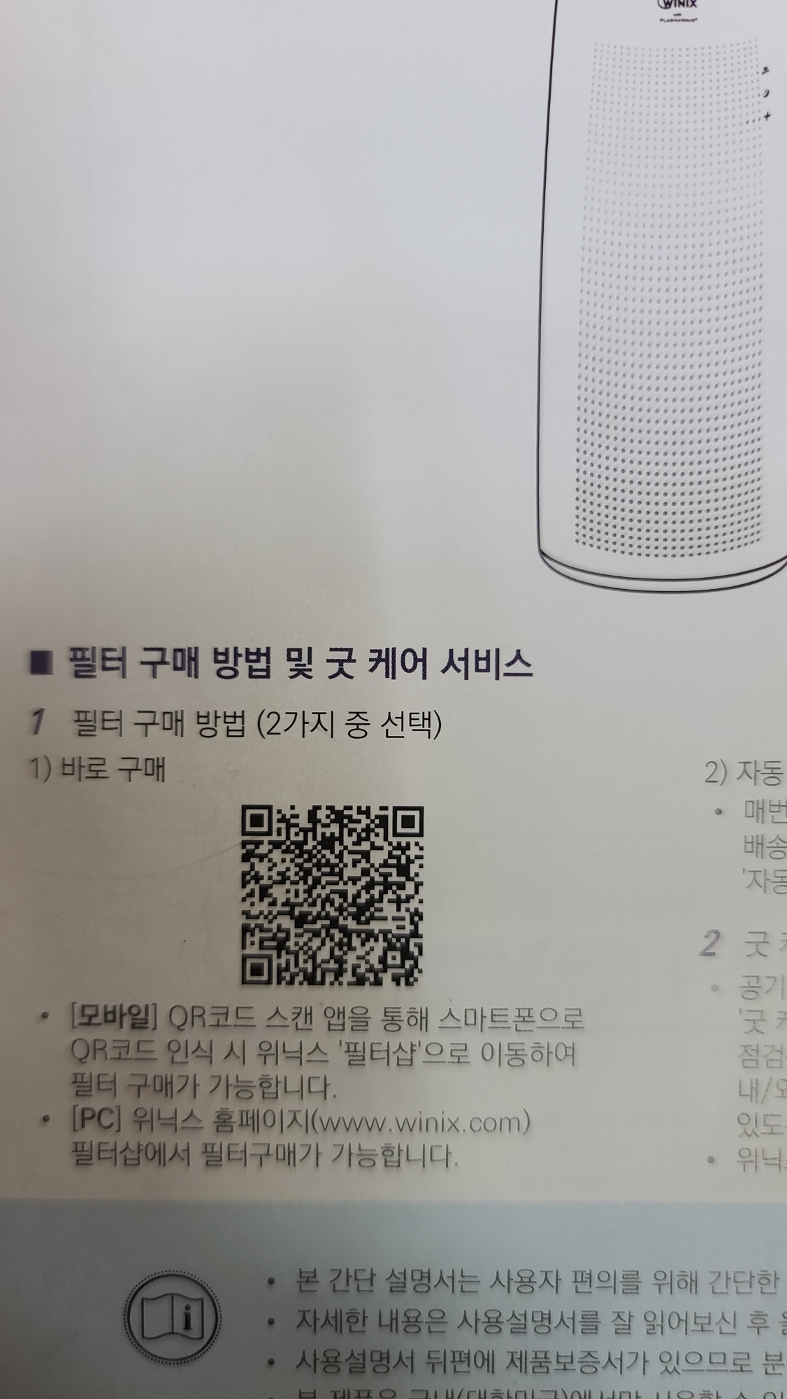 아래 사진을 보면 모바일로 구매할 땐 QR코드를 찍으라고 돼 있다. 컴퓨터로 살 땐 주소를 입력하라고. PC로 접속하면 구매 항목을 잘 못찾을까봐. QR코드를 찍었다. 그런데 웬걸. 나는 QR코드를 찍으면 곧바로 필터 구매 페이지로 연결되는 줄 알았다. 그런데 그냥 위닉스 홈페이지 첫 화면으로 접속된다. 요즘 웬만하면 스마트폰으로 뭔가를 안하려고 했는데. 눈만 버렸다.어차피 홈피로 접속하나 QR코드 찍으나. 더더군다나. 스마트폰에서 홈피 주속 입력하나. 아무런 차이가 없었다. 그래서 결국 전화했다.