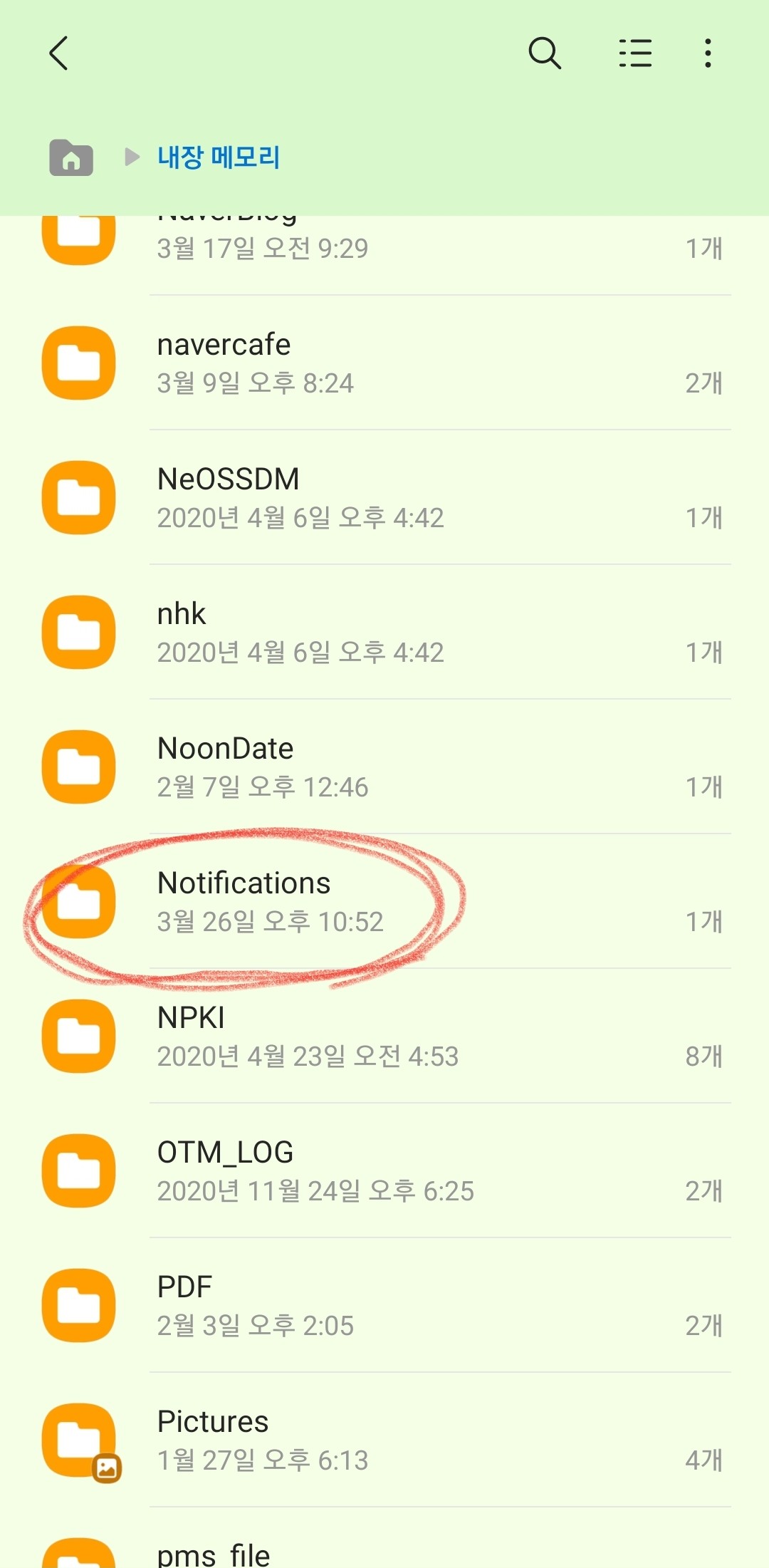 7. 내장 메모리 항목에서 Notifications 폴더를 찾아 '터치'한다