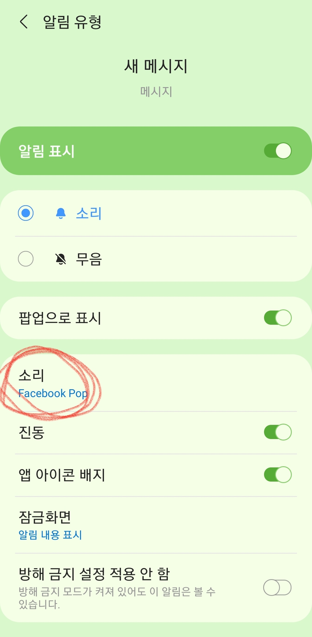 마지막으로 문자메시지 앱에서 설정을 바꿔주기만 하면. 문자메시지 알림 소리를 바꿀 수 있다.