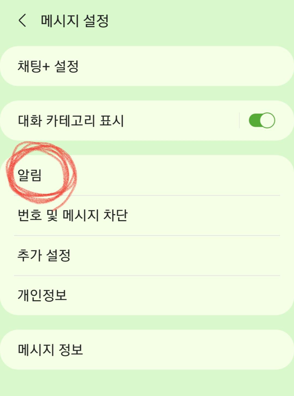 4. 문자 메시지 설정 중에서 <알림>을 터치해준다