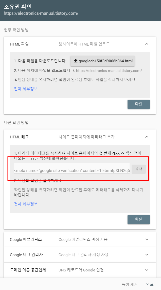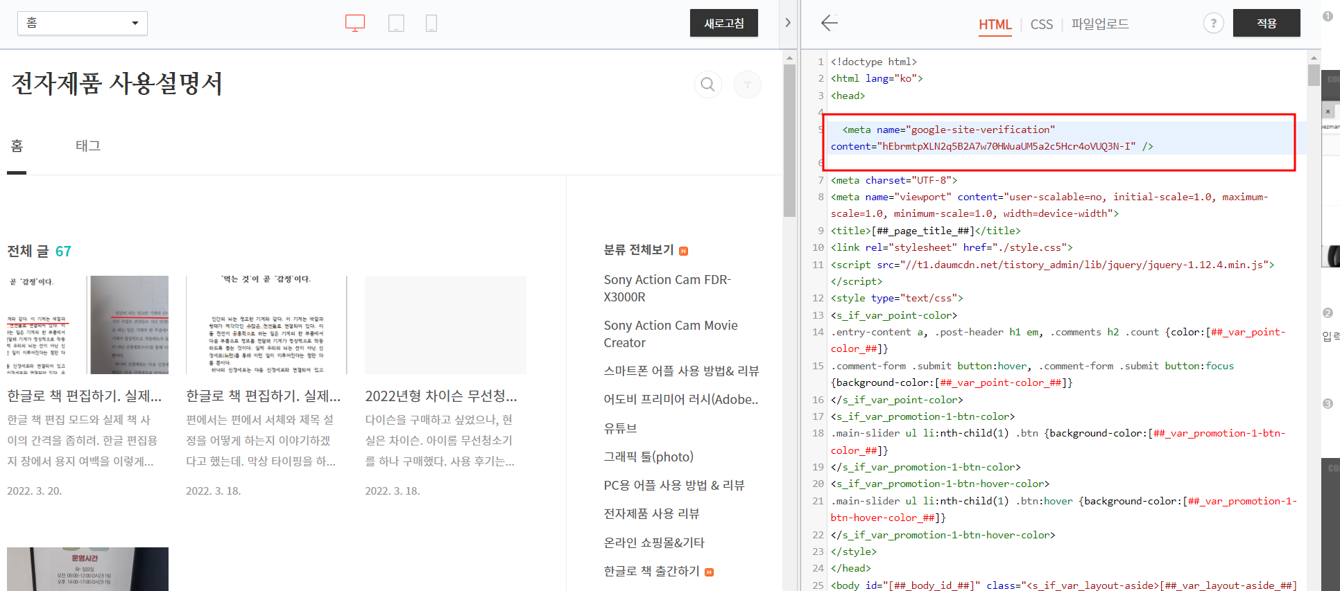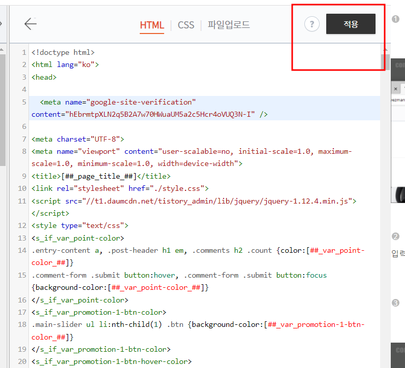 1. 위의 사진에서 <html 태그> 모드를 선택하고. 구글 서치 콘솔이 원하는 코드를 복사해야 한다.