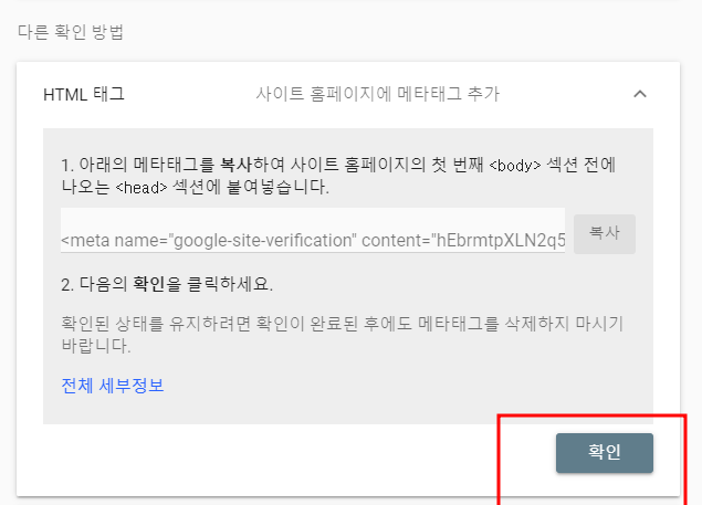 8. 이제 다시 구글 콘솔 소유권 확인 창으로 되돌아 간다. 그런 다음 아래 사진에서 빨간 박스로 표시해 놓은 것처럼 <확인> 버튼을 눌러준다.