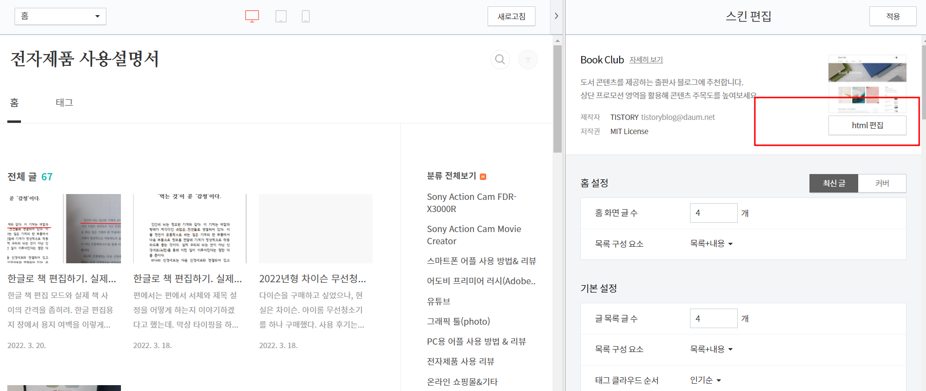 3. 그러면 아래 사진 오른쪽에. 내가 빨간 박스로 표시해 놓은 것 처럼 <html 편집> 버튼이 나온다. 그걸 클릭해준다.
