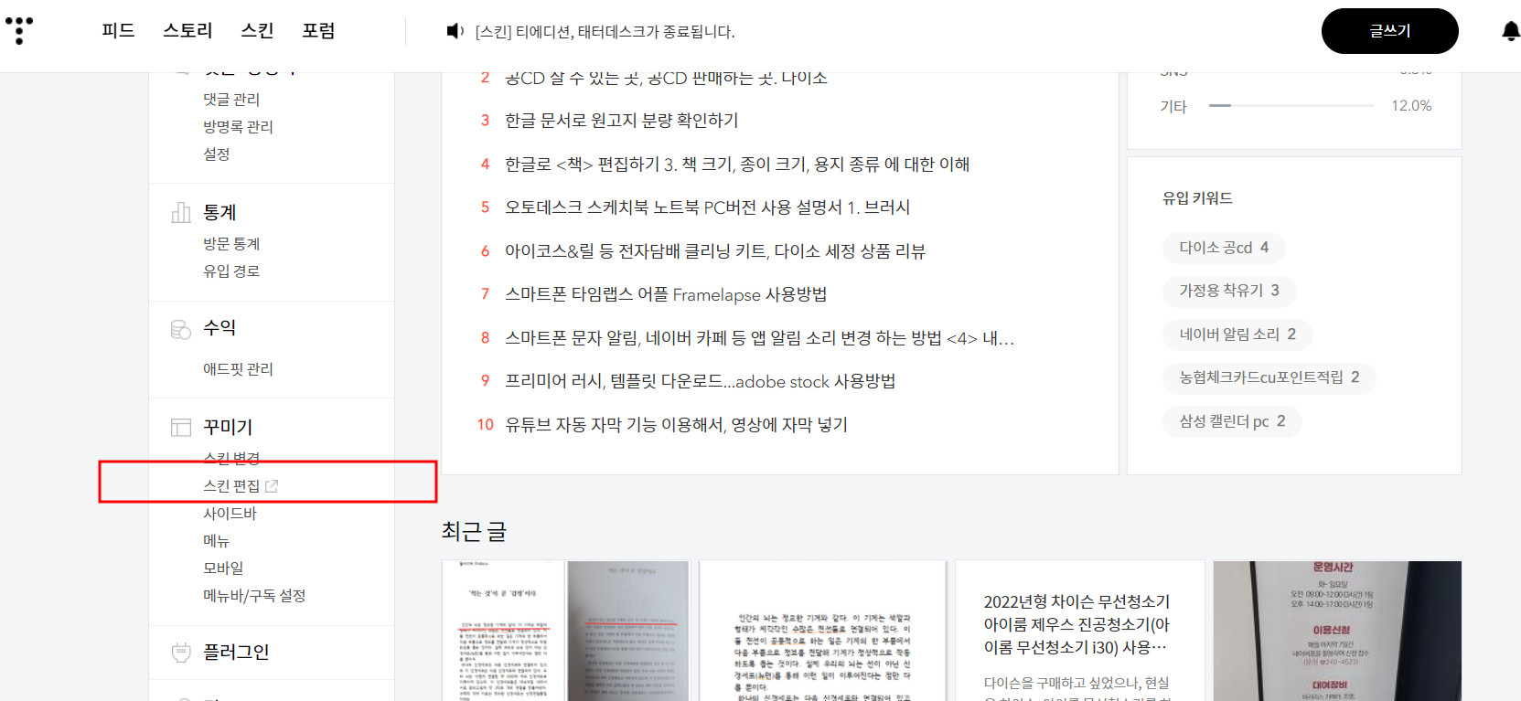 2. 아래 사진에서처럼 스킨편집 버턴을 찾아 클릭해 준다.