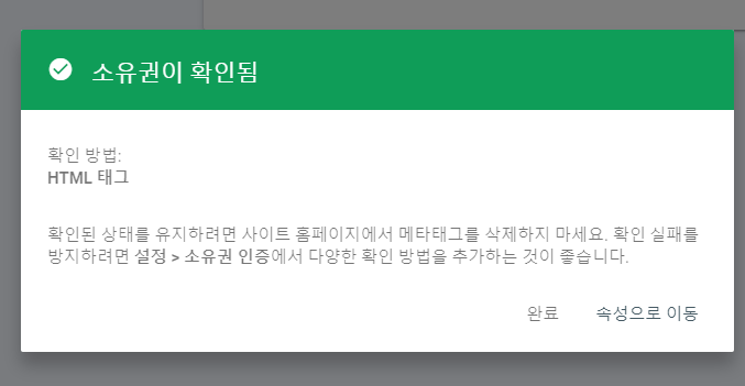 9. 구글 서치 콘솔에서 <소유권 확인>이 되었다는 메시지가 뜬다.