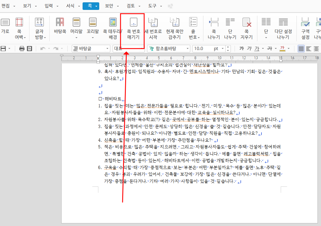그러면 아래 그림처럼. <쪽번호 매기기>라는 메뉴가 나타난다.