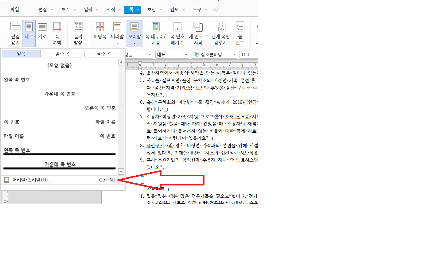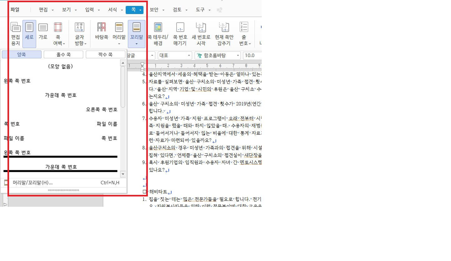 그래서 두번째 정리할 한글 문서 편집 기능은 <꼬리말> 기능이다.
