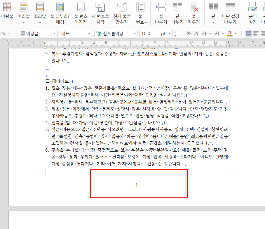 <넣기> 버튼을 눌러서. 쪽 매기기가 완성된 한글 문서의 모습이다. 매우 간단하다.