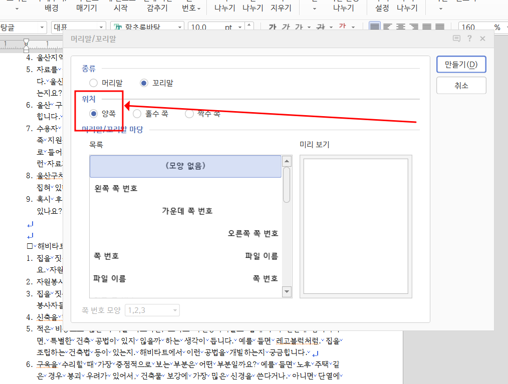 그러면 아래 그림과 같은 창이 뜬다. 그러면 내가 빨간 박스로 표시 해 놓은 부분. 나는 양쪽 모두 페이지를 매기고 싶으므로. 양쪽으로 설정해줬다.