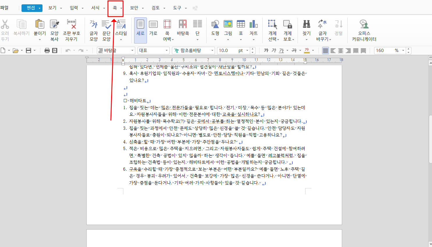 아래 사진을 보면. 한글 메뉴에서 <쪽>을 볼 수 있을 것이다. 한글 문서에서 쪽을 클릭해준다.