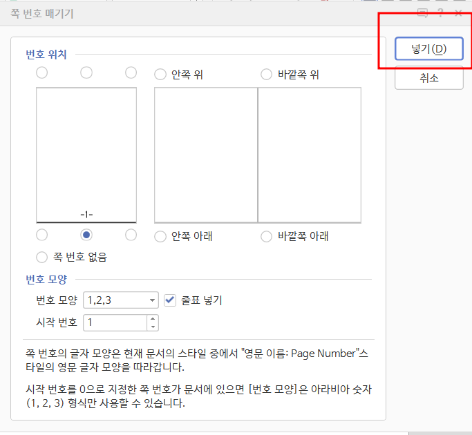 위 그림에서 보듯이 쪽(페이지)를 가운데 매길 수도 있고. 왼쪽 한켠에 또는 반대로 오른쪽 한켠에 매길 수도 있다. 내가 원하는 방식에 표시를 해주고. 그림속에 내가 빨간 박스로 표시해 놓은 <넣기> 버튼을 클릭하면 된다.