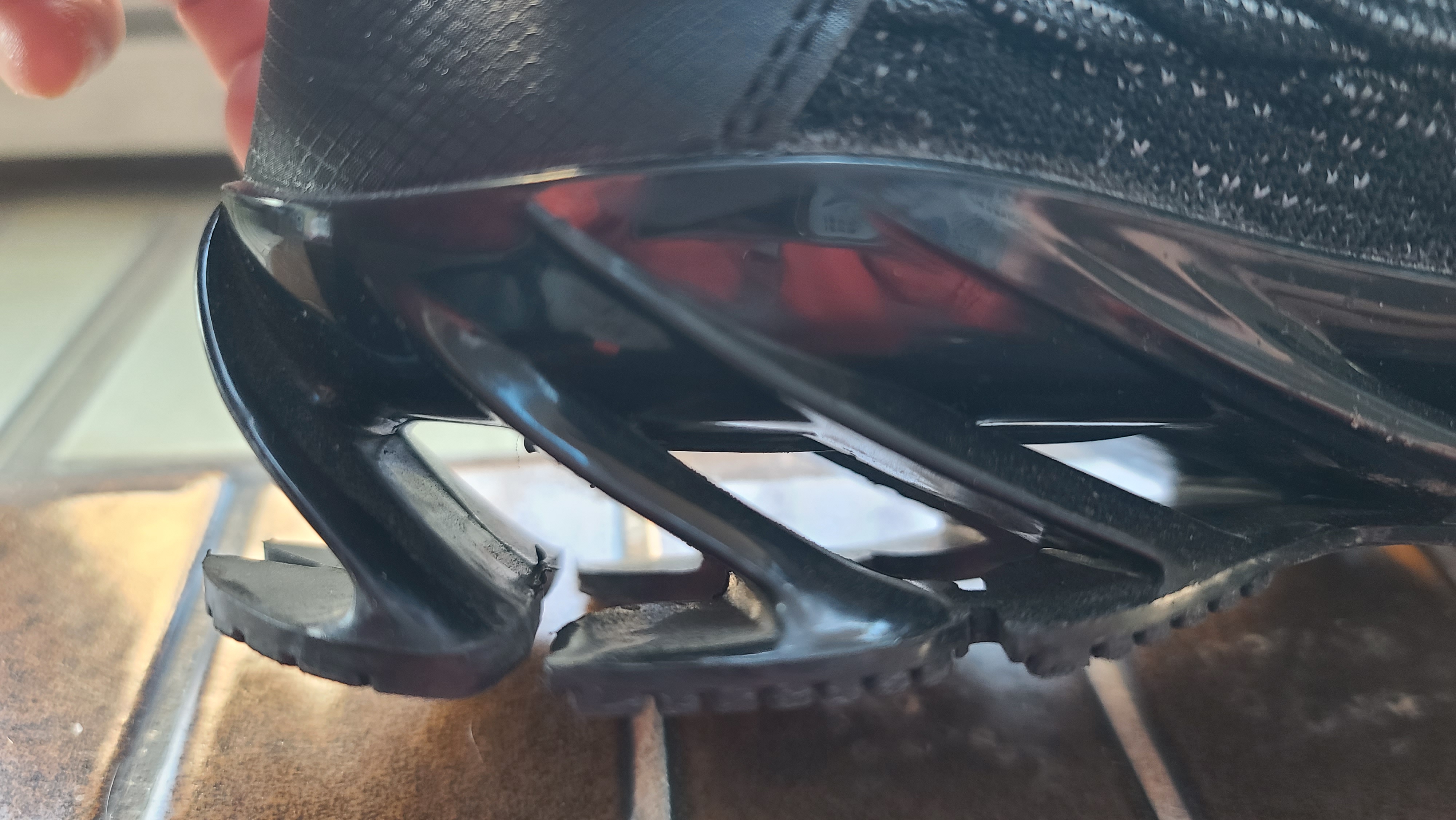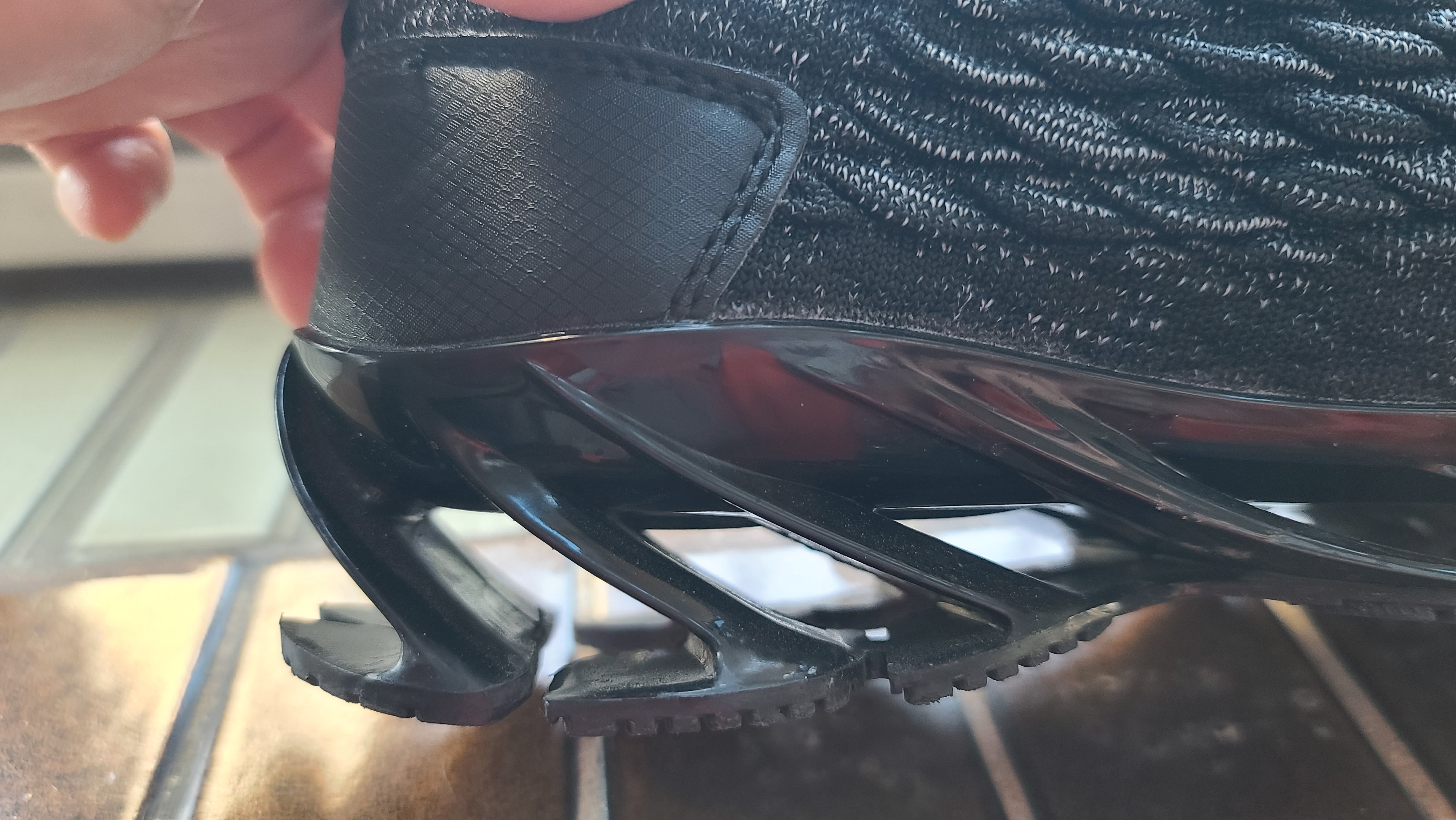 이렇게 생긴 신발 밑창이니. 물렁한 소재를 사용할 수는 없을 것이다. 신발 밑창이 뻥 뚫려 있는데. 물렁물렁하면, 발목 접질리기 딱 좋을테니까.
