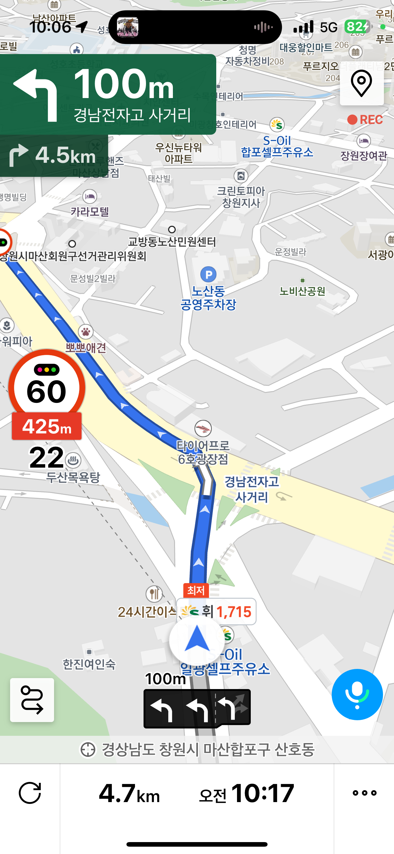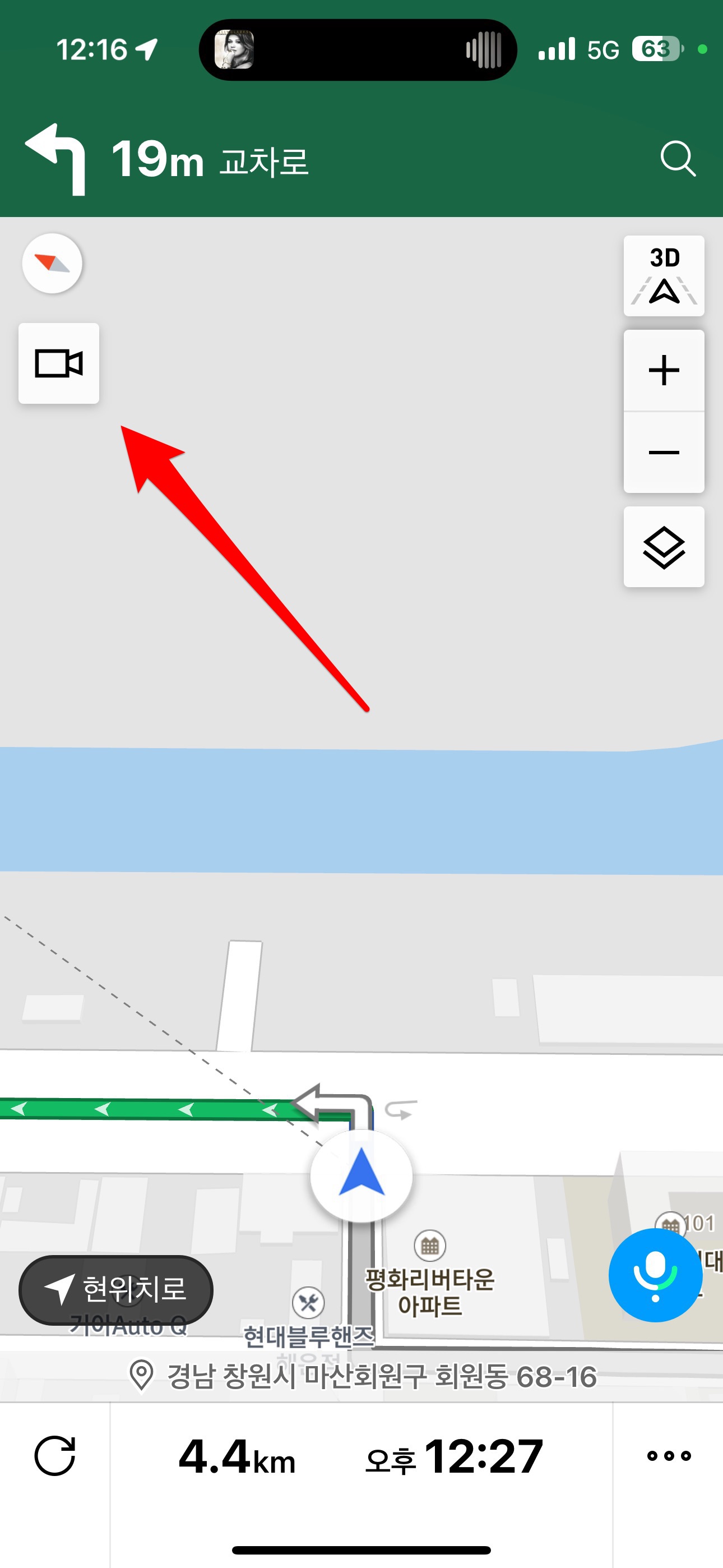 블랙박스 촬영 화면이 나타난다. 화살표에 표시돼 있듯. 왼쪽 상단에 영상 녹화 박스가 나타난다.