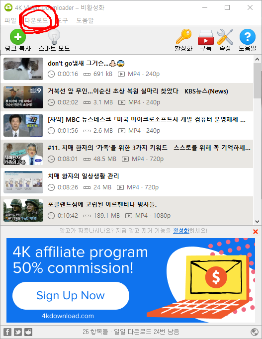3. 다시 4K Video Downloader로 돌아와 다운로드 탭을 클릭한다.