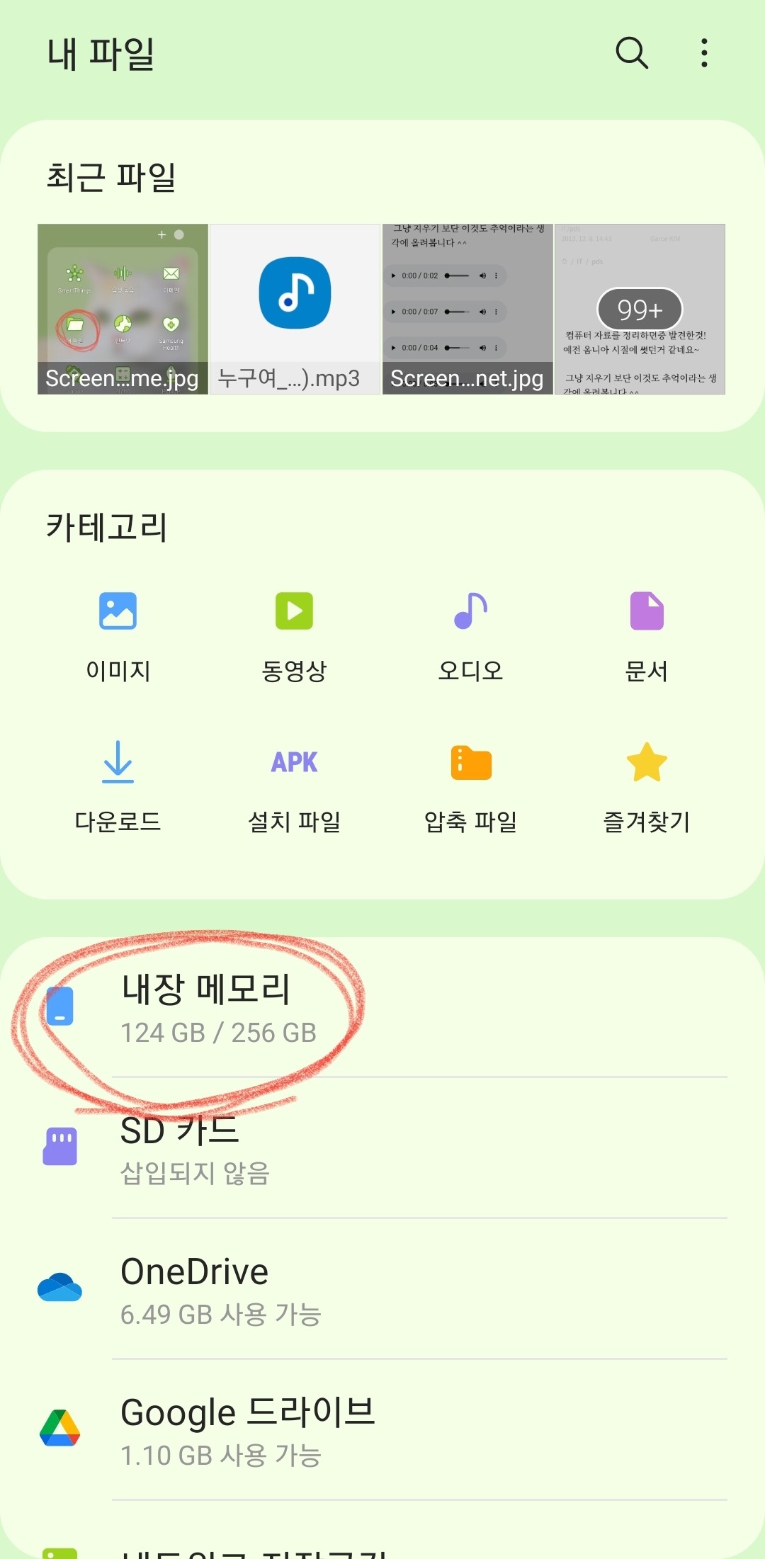 - 아래 사진에 내 파일 폴더를 빨간펜으로 동그라미표시를 해놓았다. 그곳을 터치하면 된다. (PC가 아니니까 클릭이 아니라 터치다.)