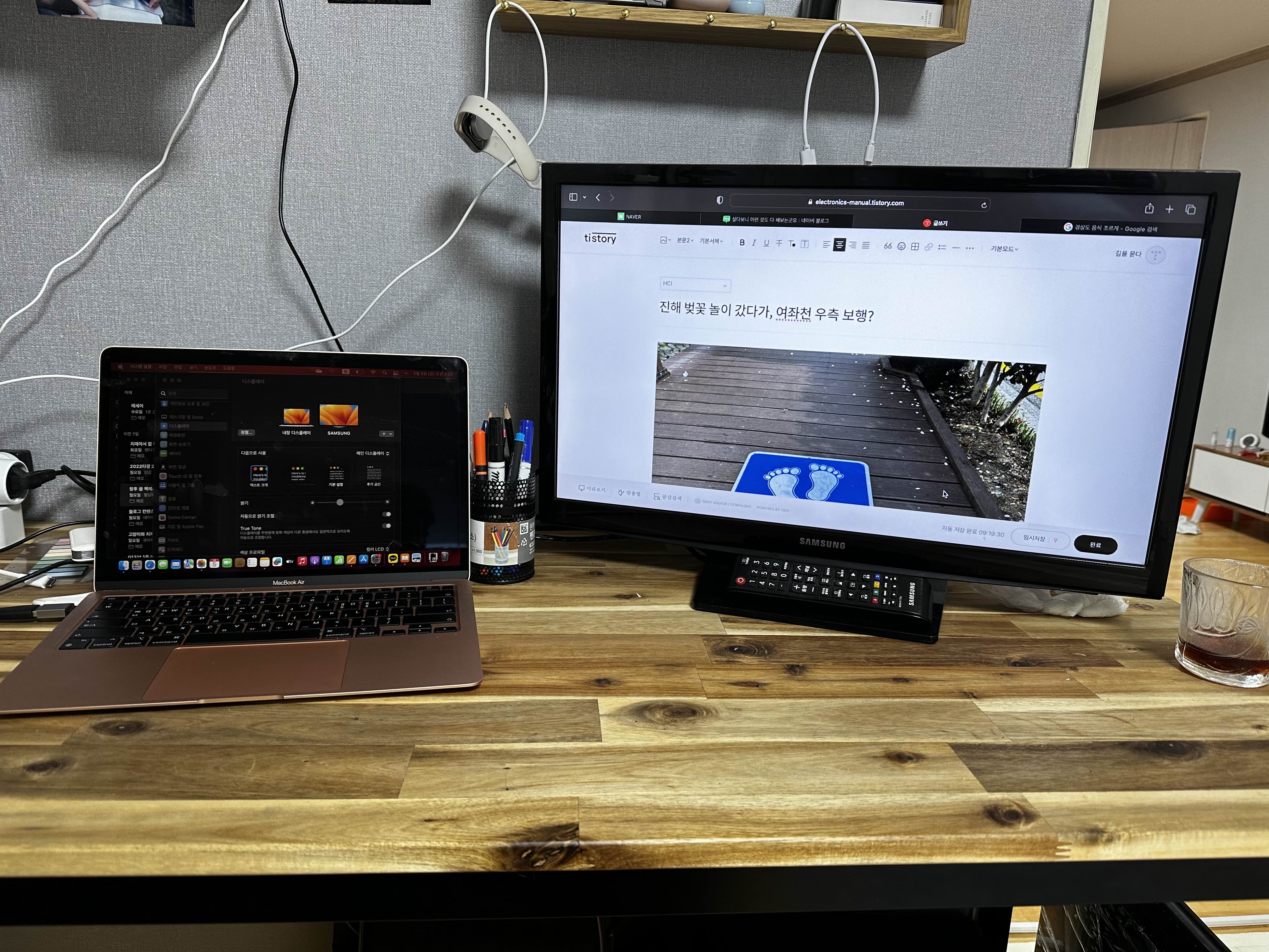 나이가 들면서 노트북의 작은 화면이 점점 부담이 되고 있다. 그래서 보조 모니터를 사용하고 있는데, 보조모니터를 사용하면서 삼성과 애플의 를 새삼 실감하고 있다. 모니터를 별도로 구매하기에는 좀 돈이 아까운 측면이 있어서. 집에서 놀고 있는 TV를 보조모니터로 사용하고 있다. 그런데 애플 맥1과 보조모니터를 연걸하고 난 뒤 깜짝 놀랐다. 화면을 분할해서 사용할 수 있었기 때문이다. 이게 무슨 말이냐고? 화면 분할 되는 것은 당연한 것 아냐? 이럴 수 있을텐데. 아래의 사진을 한번 보자. 삼성 노트북과 보조모니터를 연걸했을 때 장면이다. 사진 크기가 작아서 감이 잘 안잡힌다고? 이건 보조모니터의 화면을 사진으로 찍은 것이고. 요건 노트북의 화면을 사진으로 찍은 것이다. 그렇다. 노트북 화면과 모니터 화면이..